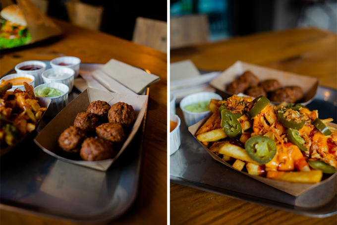 Bei den Beilagen wird das Level definitiv auf eine neue Stufe gehoben, denn die Beyond Meat Balls sind frittiert, was sie außen schön knusprig und innen richtig saftig werden lässt – einen Unterschied zu klassischen Meat Balls kann man fast nicht schmecken. Unser Tipp: Dippt sie in BBQ-Soße. Auch die Pommes sind schön knusprig, gut gewürzt und innen cremig. Besonders gut passen dazu Chili und Aioli-Mayo. Schärfeliebenden empfehlen wir die Pommes mit Chili-Mayo, Ketchup, Röstzwiebeln und Jalapeños, eine tolle Kombination.