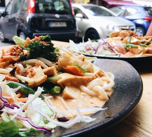 mom's in Treptow gehört definitiv zu unseren Lieblingsvietnamesen. Hier gibt es neben erstklassigem Sushi eine komplett vegane Karte mit leckeren Vor- und Hauptspeisen. Unser Favorit auf der Karte ist die unfassbar gute vegane Ente, die kross gebacken und im Sesam-Mantel daherkommt. Wahlweise könnt ihr euch diese auf einem Gemüsebett in Curry-, Mango- oder Erdnusssoße servieren lassen. Aber auch der Reisnudelsalat und die Frühlingsrollen sind ein Traum und dann ist auch noch alles vegan. Kleiner Tipp: Für einen kleinen Aufpreis bekommt ihr die meisten Gerichte auch mit Udon-Nudeln, we like!