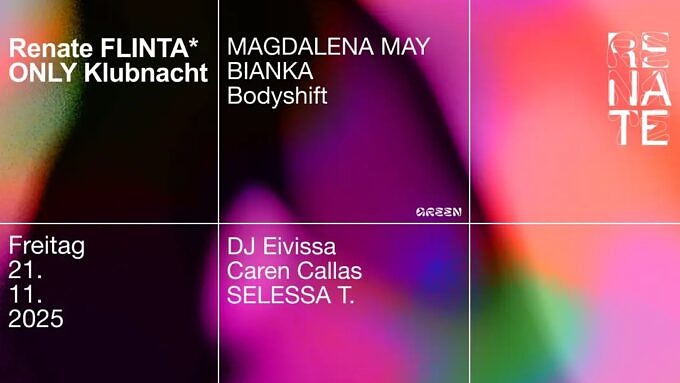 Wenn ihr eine Clubnacht sucht, die wirklich Raum schafft, seid ihr bei der FLINTA* Nacht in der Renate genau richtig. Auf drei Floors legen ausschließlich FLINTA* Artists auf – von Hemka über Bianka bis Caren Callas. Die Tür achtet bewusst auf ein respektvolles Miteinander, damit ihr frei tanzen könnt, ohne Kompromisse. Ein Abend für alle, die Community feiern wollen statt nur den Beat.