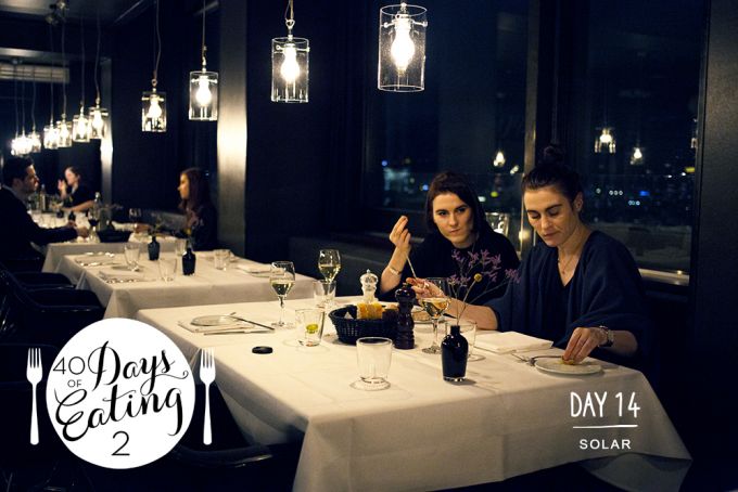 Wer oben ist, speist auch gerne oben. Die anderen Gäste sehen schon sehr schick aus, die Männer tragen fast alle Krawatte. Ins Solar geht man also gerne mal geschäftlich, wenn man ein bisschen Eindruck schinden will. Allerdings ist das Publikum in der Bar ein Stockwerk weiter oben (ja, es geht noch höher!) etwas lockerer drauf und bunter gemischt.