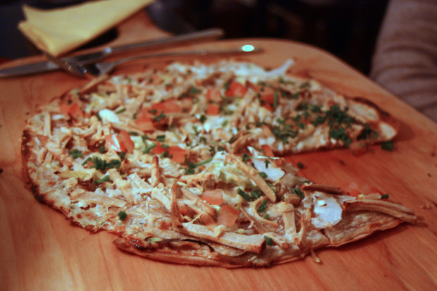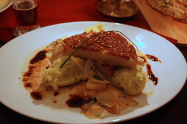Allerdings – auf die Karte im Internet sollte man sich nicht ganz verlassen. Ich hatte mittags nämlich die im Internet abrufbare Karte vor lauter Hunger quasi auswendig gelernt, nur um dann abends zu sehen, dass es ganz andere Speisen gab. Macht zwar nichts, die Speisekarte war sogar viel reichhaltiger als die im Internet, aber trotzdem. Unbedingt probieren sollte man meiner Meinung nach die Brotzeit mit Zwiebelschmelz (mhhhh!!!), die «Berliner Antipasti» (der Name ist echt... sagen wir mal schräg, aber dahinter verbirgt sich eingemachtes Gemüse) und die «Braufladen». Das ist sowas wie Flammkuchen, nur mit einem Bierteig (ja, das hausgemachte Bier ist drin!) und wird in der Pfanne gebacken. Aber auch die Tageskarte hält wirklich leckere Überraschungen bereit: Christoph war von seinen Kohlrabischnitzeln mit Chicorée-Orangen-Ragout und grünem Kartoffelpü ganz begeistert.