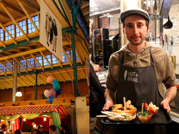 Angefangen hat unsere Tour der Fresserei an einem Stand für Pork Buns: David bietet unter dem Nome de Guerre »Zuhause Berlin« mit Ahornsirup glasierten Schweinebauch an. Laut Fotografin Kyra, die probiert hat, ein zartschmelzender Traum. Ich hatte aber anderes vor, mich zog es zum Stand von Michael Wickert. Michael ist ein irre sympathischer Typ, der schon als Kind gerne angelte. Was läge da näher, als Erwachsener das ganze einfach professionell zu machen? Mit seinem Master in Fischereiwesen und einiges an Arbeitserfahrung in der Tasche, hat er in der Markthalle seine eigene Fischräucherei eröffnet. »Glut und Späne« gibt es jetzt schon seit Oktober und bietet, als wohl einziger Fischladen Berlins, ausschließlich Ware aus nachhaltigem Fang an. Und als wäre das nicht genug, es wird auch alles, einfach alles, was über den Tresen wandert, im eigenen Räucherofen direkt im Stand selbst gemacht. Wir finden das nicht nur vorbildlich, sondern auch irre lecker. Sogar an Vegetarier denkt Michael und räuchert auch Käse. Für die Ceviche, ein südamerikanischer Salat mit rohem Fisch, sollte man allerdings früh kommen. Sie ist immer als erstes ausverkauft (aus ziemlich gutem Grund). Und weil Fisch ja auch schwimmen will, bietet Michael jeden Donnerstag jetzt auch Cocktails an. Ganz bestimmt aber ohne Meeres-Note.