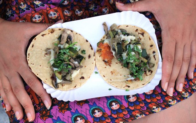 Doch das, was wir nach teilweise obszön langem Anstehen in die Finger – und respektive unsere Münder – bekommen haben, war ganz schön toll: Als erster Gang Tacos von «Taco Kween». Ausserdem ist der hübsche Junge an der Pfanne trotz Hitze, Stress und noch mehr Hitze unglaublich nett und freundlich geblieben. Und wirklich hübsch, natürlich. Davon abgesehen waren auch die Tacos sehr lecker, für mich gab es die Veggie-Variante mit Pilzen, Zucchini und Unmengen leckerem zerlaufenen Käse. Mhhhh! Auch gut zu wissen: Die Betreiber haben ihre eigene Maismühle und machen ihre Tortillas selbst. Später folgte noch ein Shrimps-Burger (!) aus dem Bunsmobile. Das betreiben Mathilde und Pablo, beide Franco-Kanadier und Fans guter Burger. Wenn sie nicht für lechzende Blicke auf dem Bite Club sorgen, stehen sie unter anderem auf dem Cassiopeia-Gelände vor dem Urban Spree. Angeblich gehören ihre Burger zu den besten der Stadt.
