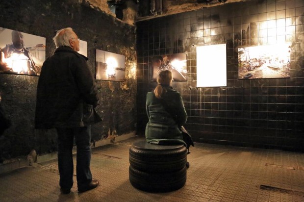 Bilder des Eröffnungsabends zeigen betroffene Gesichter. Hinter den Bildern bröckelt die Wand. Seit vielen Jahren dokumentiert JUST fotografisch die weltweite Street Art-Szene. Letztes Jahr entschied er mit seiner Kamera in den syrischen Bürgerkrieg zu ziehen. “Seitdem ich mich dazu entschieden habe, nach Aleppo zu fahren,” schreibt er in einem Brief, “habe ich ein mulmiges Gefühl – irgendetwas zwischen Spannung und Angst. Meine Erwartungen an diese Reise waren diffus (…) Ich bin Fotograf, und den Wunsch, einmal in eine Krisenregion zu fahren, habe ich schon seit Jahren. Dass es gerade jetzt Syrien geworden ist, war eine Verkettung von Zufällen.”