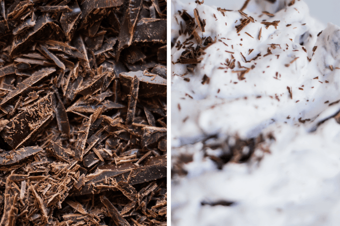 7. Dunkle Schokolade mit einem großen Messer zerhacken und unter die Sahne heben.