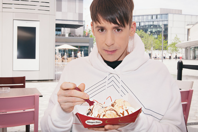 Ja genau. Die Idee entstand an einem Sonntag. Ich lag morgens in meinem Bett und habe mich auf den freien Tag gefreut. Da habe ich sogar ein Selfie von mir gemacht und an einen Freund geschickt, obwohl ich das sonst hasse. Und dann kam ich mit Häagen-Dazs ins Gespräch, denn was ist besser, als an einem Day off Eis zu essen? Eigentlich sollten es drei Outfits werden, die vom Eis inspiriert werden. Aber jetzt sind es neun, weil ich das so cool fand.