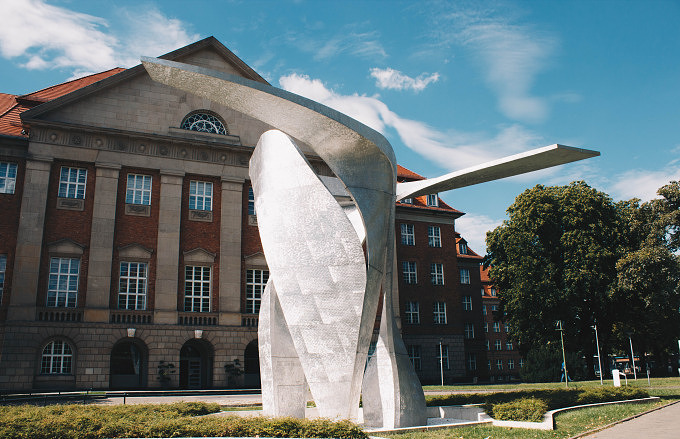 Direkt neben dem Schaltwerkhochhaus befindet sich das historistische Siemens Verwaltungsgebäude, in dem nach dem Zweiten Weltkrieg der Siemens-Vorstand und die Direktion beheimatet war. Stefan erzählt uns, dass das Gebäude sogar größer als sämtliche Berliner Rathäuser ist. Das muss man erstmal schaffen! Heute befindet sich hier die Siemens Deutschland Zentrale. Ihr solltet unbedingt vor diesem Eingang des Gebäudes Halt machen, denn hier steht seit einiger Zeit die 10 Meter hohe Skulptur "The Wings" von Architekt und Künstler Daniel Libeskind, der unter anderem auch das Jüdische Museum Berlin entworfen hat. Im Zusammenspiel mit der historischen Fassade des Siemens-Gebäudes entsteht so ein besonders schönes und kontrastreiches Zusammenspiel zwischen Alt und Neu. Insgesamt existieren vier dieser beeindruckenden Aluminium-Skulpturen, die eine "Innovation Bridge" zwischen wichtigen Siemensstandorten auf der Welt bilden. Die drei weiteren Wings-Exemplare stehen vor der neuen Siemens-Zentrale in München, am wichtigen Standort Erlangen und vor der italienischen Siemens-Niederlassung in Mailand. Dort wurden die „Wings“ übrigens auf der EXPO 2015 zum ersten Mal ausgestellt. Mit dem künstlerisch-architektonischen Beitrag will Siemens auch ein Zeichen in Richtung Zukunft und für technologischen Fortschritt setzen.