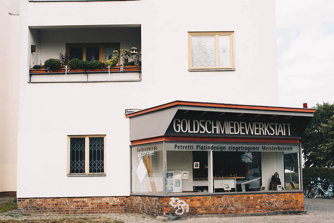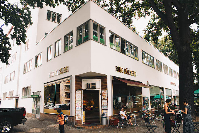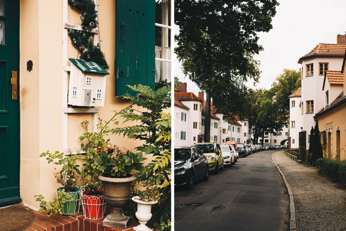 Wir verlassen den Park am gegenüberliegenden Ausgang und finden uns direkt in der eigentlichen Siedlung Siemensstadt wieder. Wären wir uns nicht sicher, dass wir uns in Berlin befinden, könnte man denken, hier direkt auf dem Dorf gelandet zu sein. Denn die Häuserensembles in der Raps-, Rieppel- und Harriesstrasse sind einfach Idylle pur. Ein kleines Wohnhaus nach dem anderen reiht sich aneinander und auch hier sehen wir immer wieder kleine Dorfplätze in den Straßen, auf denen gerne Feste gefeiert werden, wie uns Stefan später erzählt. Am Ende der Rapsstraße könnt ihr in Tanjas Backparadies eine kurze Pause einlegen und einen Kaffee schlürfen. Tipp: Probiert ein Stück des Bienenstichs, das gibt Energie und Power für den Rest der Kieztour. Außerdem ist der kleine Tante-Emma-Laden sozusagen die Nachrichtenzentrale für die ganze Nachbarschaft. Während wir hier sitzen grüßt unser Guide in einer Tour Menschen, die auf dem Fahrrad vorbeifahren. Wie gesagt: wie auf dem Dorf.