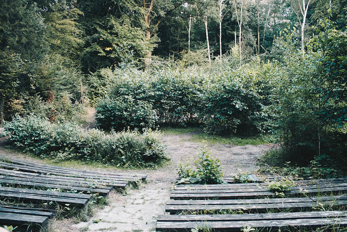 Aber da war ja noch etwas. Stefan verrät uns, dass im hinteren Bereich des Kulturbiergartens noch eine Überraschung auf uns wartet. Wir stapfen los und sehen zunächst einmal gar nichts, außer Wald. Aber je weiter wir uns durch Sträucher und Bäume schlagen, desto eher lässt sich erahnen, dass sich hinter dem Dickicht tatsächlich ein Stück Kultur befindet, nämlich eine alte Freilichtbühne. Wenn man nichts davon weiß, lässt sich dieser verwunschene Ort kaum erahnen. Die Gustav-Böß-Freilichtbühne soll mit Hilfe von Bezirksmitteln bald wiederbelebt werden, dann sollen hier musikalische Vorführungen und Theaterstücke stattfinden. Dem Name "Kulturbiergarten" würde man dann auf jeden Fall wieder gerecht. Wenn ihr in der Nähe seid, schaut unbedingt einmal vorbei – ist nämlich absolut sehenswert.