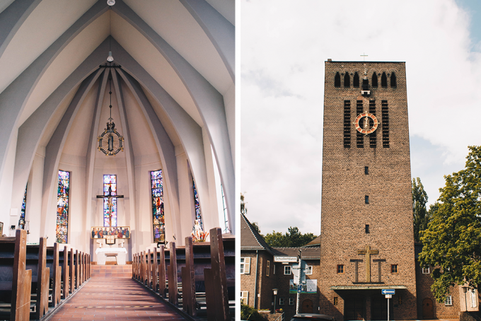 Nur ein paar Schritte weiter erblicken wir eine der zwei Kirchen in Siemensstadt, die auf den ersten Blick gar nicht besonders auffällig wirkt. Entworfen wurde die katholische St. Joseph-Kirche ebenfalls von Siemens-Architekt Hans Hertlein. Wenn ihr sie betretet (immer donnerstags ist hier Tag der offenen Kirche) werdet ihr aber überrascht sein, welch schönes Licht durch die Kirchenverglasungen fällt und ihr könnt, wenn ihr wollt, einen Moment innehalten und die Ruhe auf euch wirken lassen. Machen wir ja ohnehin alle viel zu selten. Nicht weit von hier entfernt befindet sich auch die evangelische Kirche, ein Rundbau aus dem Jahr 1931, ebenfalls geplant von Hans Hertlein. Besonderheit hier: Mitten in der Rotunde des Innenraums gibt es einen akustischen Mittelpunkt, der auf dem Boden markiert ist. Wenn ihr an exakt diesem Punkt eure Stimme erhebt, erlebt ihr ein fantastisches Echo-Sound-Erlebnis. Zu erklären, wie das Ganze physikalisch funktioniert, würde hier den Rahmen sprengen. Probiert's einfach mal aus. Ist ein irres Gefühl!