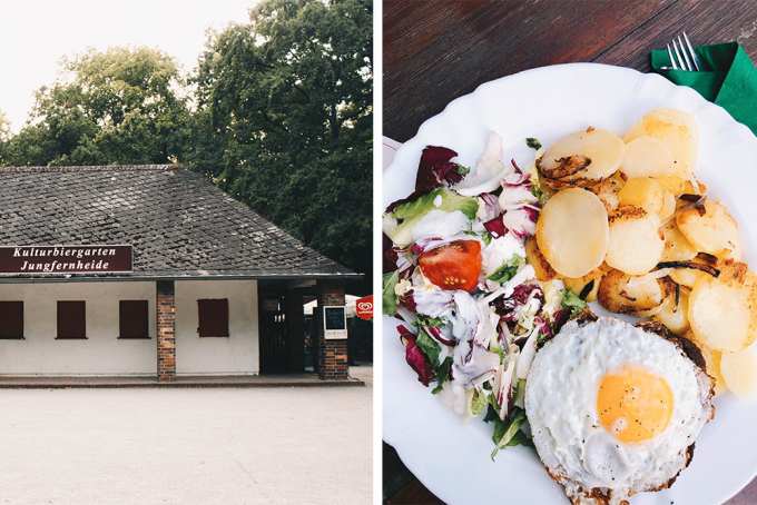 Hungrig und durstig stranden wir am Abend nach unsere Kieztour im Kulturbiergarten, ein kleiner, aber feiner Biergarten im Herzen der Jungfernheide. Hier geht es mit Selbstbedienung und Biergartengarnituren eher rustikal zu, dafür ist die Stimmung umso entspannter. Genau das Richtige nach einem Tag wie diesem mit vielen tollen Eindrücken. Auf Empfehlung von Stefan bestellen wir die Riesenboulette mit Bratkartoffeln, Salat und Spiegelei und natürlich ein Radler. Wir sind hier schließlich in einem Biergarten. Die Preise sind absolut fair und auch geschmacklich werden wir nicht enttäuscht: den Teller haben wir jedenfalls ratzfatz aufgeputzt.