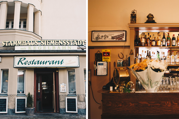 Direkt gegenüber könnt ihr ins Stammhaus einkehren. Das Restaurant hat hier im Siemens-Kiez längst Kultstatus erreicht, denn seit Jahrzehnten treffen sich hier Siemensstädter*innen, um abends gemeinsam ein Bierchen zu trinken, den neuesten Klatsch und Tratsch auszutauschen oder um etwas Deftiges zu essen. Wer auf echten Eckkneipen-Charme steht, ist hier bestens aufgehoben. Im Sommer gibt es vor der Tür auch einen kleinen Biergarten, von dem aus das Treiben auf der Straße entspannt beobachtet werden kann. Pascal, der neue Wirt, hat das Restaurant erst vor Kurzem übernommen und zeigt uns seinen ganzen Stolz – die Kegelbahn im Keller. Ein absolutes Highlight, denn wir fühlen uns direkt ein wenig zurückversetzt in alte Zeiten und wollen am liebsten gleich loskegeln. Im Stammhaus trifft man sich zu Jubiläumsfeiern, Jahrestreffen oder Vereinssitzungen. Wir sagen mal so: Oldie but goldie!