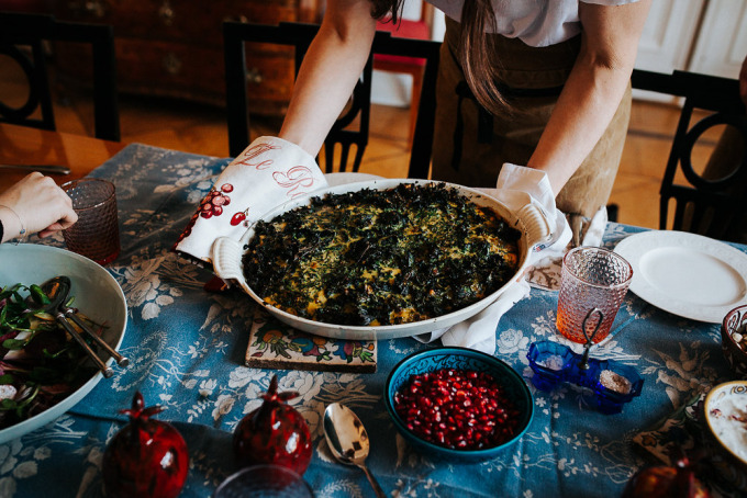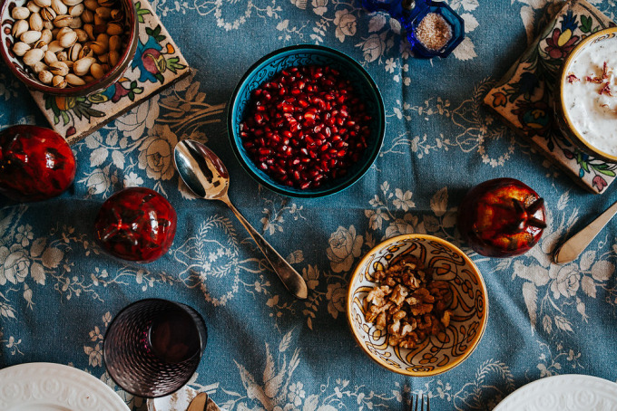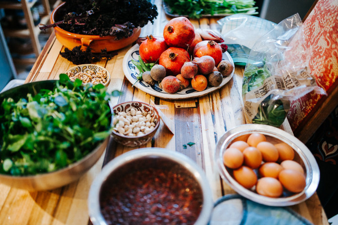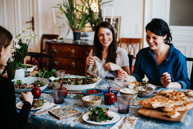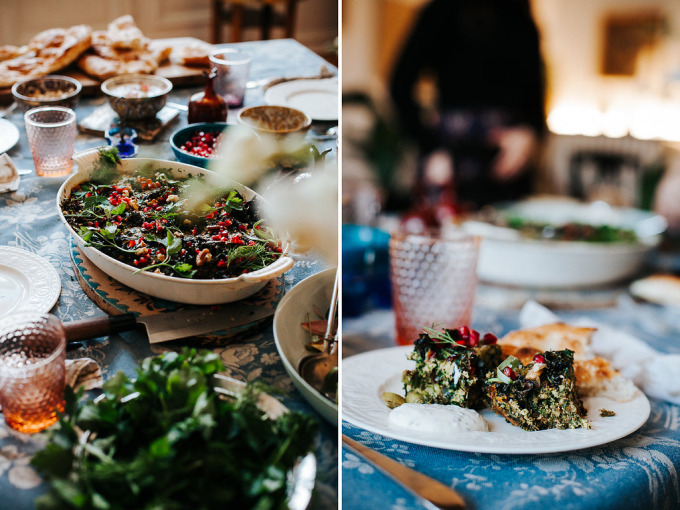 Wir haben uns in der Wohnung ihrer Eltern getroffen. "Hier kochen wir am liebsten", erzählen die beiden. Die Küche kommt uns von Fotos auf ihrer Homepage bekannt vor, diese Fliesen und diesen Ofen vergisst man so schnell nicht. Wir schnippeln gemeinsam Gemüse und Kräuter, zupfen Kohlblätter, entkernen Granatäpfel, stecken unsere Nase tief in Gewürzgläser und trinken Tee. Es wird viel geredet, gelacht und vor allem viel und gut gegessen. Die beiden haben ein persisches Kräuteromelett zubereitet, dazu einen Wintersalat mit Rüben und einen leckeren Joghurt mit Rosenblätter. Aber genug verraten. Ob sich die beiden beim Kochen oft in die Quere kommen und wo der größte Unterschied zwischen der iranischen und der deutschen Küche liegt, erfahrt ihr hier. Kommt rein und schaut euch um!