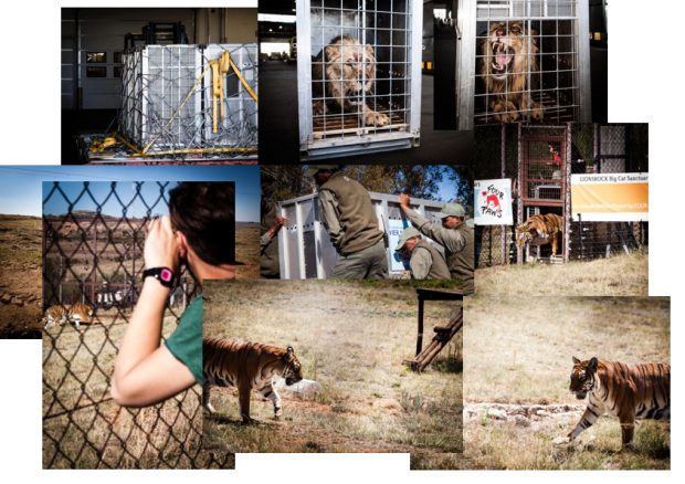 Die Tiger fürchten sich auch. Ihre Augen stehen falsch, zu viel weiß ist sichtbar als eine grimmige Mitarbeiterin den Käfig am Flughafen in Johannesburg öffnet um zu kontrollieren, ob alles noch funktioniert, am Tiger und am Löwen.